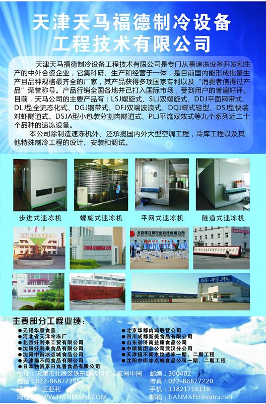 天津市天馬福德制冷設備工程技術有限公司企業概況: 天津天馬福德制冷設備工程技術有限公司(原天津天馬制冷設備工程有限公司)是專門從事速凍設備開發和生產的企業,它集科研、生產和經營于一體,是目前國內能形成批量生產且品種規格比較齊全的廠家,其產品獲得多項國家專利以及“消費者信得過產品”榮譽稱號。產品行銷全國各地并已打入國際市場,優惠的價格堅固的品質獲得了用戶的廣泛好評。 主要產品: LSJ 螺旋式、 SLJ 雙螺旋式、 DDJ 平面網帶式、 DLJ 型全流態化式、 DGJ 鋼帶式、 DFJ 雙段波浪式、 DQL 蝶式輕型、 DSL 型塊狀對蝦隧道式、 DSJA 型小包裝分割肉隧道式、 DDJY 液氮式速凍機等九個系列近二十個品種的速凍設備及 CHP100A 型春卷皮機、 SXJ-450 型雙螺旋式食品熏烤機、 KJD 型高濕空氣解凍機等食品機械。 客戶案例:河北唐山廣野集團公司一期二期;北京好利來工貿有限公司;沈陽中街冰點城食品公司;中糧集團武漢分公司;日本獨資京日丸善食品有限公司;國藥物流;佳木斯希波集團;天津外貿長城速凍食品公司;天津貓不聞食品有限公司;河北省外貿天洋冷凍廠;云南昆明友邦集團;大連肉聯廠等 出口產品:匈牙利科庫食品集團;俄羅斯漢姆斯基食品廠;印尼吳氏食品集團預冷機;日本近藤食品有限公司;加拿大苗氏食品有限公司;委內瑞拉食品集團等 我公司不僅在制作食品速凍預冷設備上取得一定成績,還致力于提高機械裝配過程中的工作效率與加工精度,被德國西門子公司認定為永久采購供應商